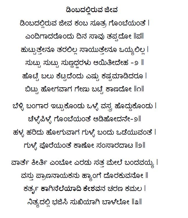- Dimbadalliruva jeeva kamba sootra gombeyanthe (ದಿಂಬದಲ್ಲಿರುವ ಜೀವ ಕಂಬ ಸೂತ್ರ ಗೊಂಬೆಯಂತೆ) (Lyrics) (Video)