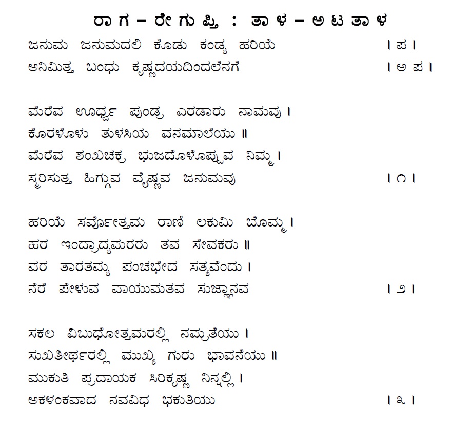 12. Januma janumadali kodu kandya hariye (ಜನುಮ ಜನುಮದಲಿ ಕೊಡು ಕಂಡ್ಯ ಹರಿಯೇ) (Lyrics)